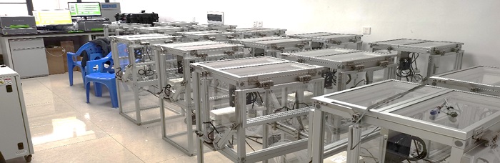 关键配置与指标:呼吸叶室(16个)、辅助泵、中央控制器等。气室尺寸为50 cm(L)×50 cm(W)×50/100 cm(H),可控自动旋转开合(上窗90°,侧窗45°),混气风扇能够快速混匀叶室内气体,加快测试进程。