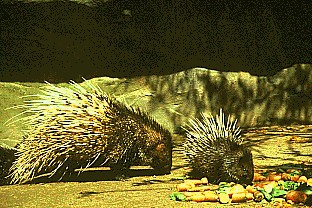 豪猪,又称刺猪或箭猪。属于哺乳纲、啮齿类、豪猪科的一种大型啮齿类动物。豪猪外形似鼠,体肥粗,头嘴有点像兔。体长56~77厘米,体重7~14千克。身体背面长有密密的长硬棘刺。头、颈和肩部的棘刺较为细短,体后部背面的刺特别粗长,长约20~40厘米,呈纺锤形,中空,乳白色,中间一段为黑褐色。全身为棕褐色,从额部到颈背部的中央有一条白色的纵纹由肩部到颔下有一些尖端呈白色的刺,形成一个半圆形的“白领”。四肢和腹面的刺短小而软,呈棕色。尾巴短,隐于背棘之下,棘刺的下层有稀疏的白毛。