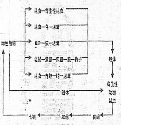 植物种子成熟后落在土壤里,很快生根发芽。幼苗从土壤吸收水分和营养物质,利用阳光和CO2制造有机物质,形成新绿色植物。绿色植物的根、茎、叶和花、果、籽实被昆虫和动物以及人类采食;青蛙、食虫鸟和其他许多动物又以昆虫为食;蛇、狐狸、黄鼬、鹰、貂等以捕食小动物为生;随之一些大型肉食动物(如老虎、豹子)又以捕杀小动物来为生;最后所有这些动物和植物残体被腐生性动物、昆虫、真菌或细菌“吃掉”。下右图展示了阔叶林中存在的这种错综复杂的食物链与食物网。