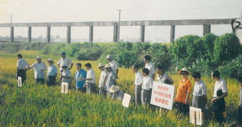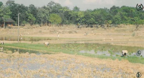 洪水退后稻田进行早熟晚稻秧苗栽扦(a),或者进行早熟早稻翻秋直抪措施,减灾生态农业技术来补救(b)。