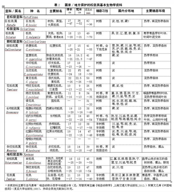 前文已指出,我国松鼠科现存确知10属29种,除了地松鼠亚科的旱獭属和黄鼠属(共10种)系“害鼠”之外,皆为国家/地方法定?;ざ铩O纸堑幕旧镅ё柿蠌∽苡诒?: