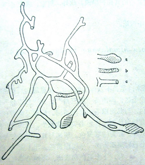 a—巢;b—粪道;c—洞口 长尾旱獭冬夏兼用洞平面图(仿赵中石1965) |