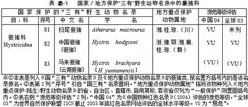 上世纪人们曾因豪猪能危害庄稼,嗜食瓜果和根茎类多汁作物,将它视作害兽,更为了肉用、药用,曾大肆捕杀,加上采伐森林,导致其数量剧减,许多地方已难见其踪。国内《中国濒危动物红皮书》(1998)、《中国物种红色名录》(2004)两次评估,皆为“易?!薄?000年国家已将所有豪猪列入《国“三有”动物名录》,南方许多省、区还将它们列为省级重点?;ざ铮?豪-2)。因此,今后捕猎豪猪也必须依法从严控制,实行“猎捕量限额管理”,未取得“狩猎证”决不容任意捕捉。