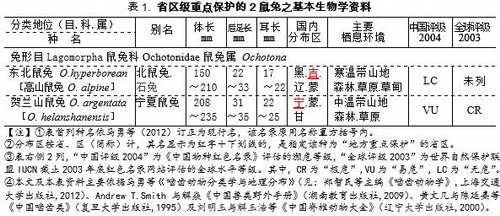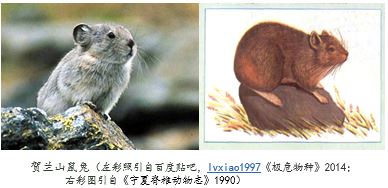 《地方重点?;ひ吧锩肌吩谕眯文糠矫?,吉林(1985)加列了“高山鼠兔Ochotona alpine”,宁夏(1990)加列了“贺兰山鼠兔Ochotona helanshanensis”。人们现实生活中通常将鼠兔视作“鼠类”,而且这2种鼠兔也很有特色,我们在本专题之末也就连帯作个介绍,其基本生物学资料汇总于表1。为同国际接轨,这2种动物皆改用现行名称,该名录原用名乃置于方括号内。