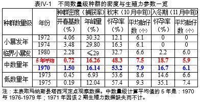 更有趣的是1980年为临界小暴发年,年峰量大概仅接近29%,其10月与11月的怀孕率和平均胎仔数都比中数量年低得多,却显著高于上述2小暴发年,入冬时怀孕率不归零,足见生殖力受抑程度与种群密度的高低紧密关联。
