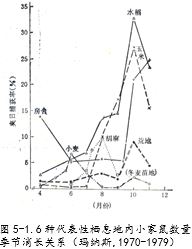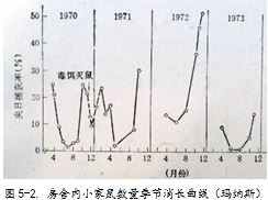 图5-2乃显示,1972小暴发年,人房鼠数夏季即偏高,秋后更是异常高;1973为负反馈抑制年,全年数量皆低。1970年11月曾进行毒饵灭鼠,但几个月后即回升,表明单一化学灭鼠作用有限。