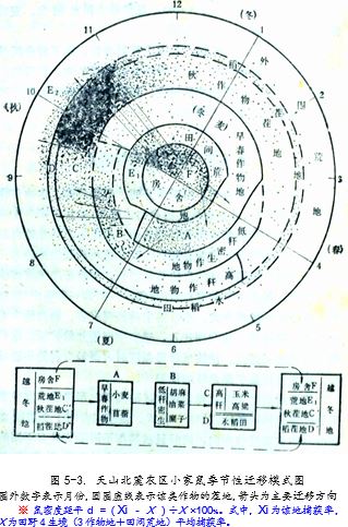 图5-3是依上世纪70年代调查资料描绘的天山北麓农区小家鼠季节性迁移模式。由该图可知,每个季节小家鼠种群都有一定的“密集地”,鼠密度距平※>10﹪以上。4月是稻茬地和田间荒地,6月是小麦地,8月是水稻田和胡麻地,10和11月是水稻田和玉米地(或两者的茬地)。其中,密度距平>50﹪的可视为该时期小家鼠“最适栖息地”,4月为稻茬地,6月为小麦地(及苜蓿地),10月为水稻田和玉米地,11月又是稻茬地。房舍区11月至翌年4月小家鼠捕获率都超出田野的平均密度1倍以上,显然是冬期小家鼠密集地和最适栖息地。因此,各时期鼠情监测重点就应瞄准这些生境。