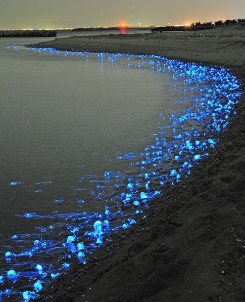 还有一类光源,就是生物发光。比如萤火虫,比如发光水母,比如鮟鱇鱼。这些由于生物体内的酶催化了一些生物反应,从而发出的光线。这些光源都是冷光源,是生物蛋白质受到激发后发光,没有剧烈的温度变化,通常光的颜色是绿色或者蓝色的,偶尔也有红色出现。中国古代就有囊萤夜读的佳话,将萤火虫作为光源在夜间读书,这里的光源就是绿白色的了。下图是日本海岸的发光水母。