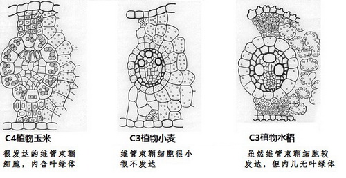 为了应对C3途径的缺陷,一些植物进化出了新的CO2固定途径,并发展出与之适应的形态特征。它们的维管束周围的细胞分化成两种:维管束鞘细胞和叶肉细胞。这些细胞整齐地排列成双层环状结构,即所谓的“花环结构”。CO2固定过程发生在叶肉细胞的细胞质中,生成一种含4个碳原子的有机酸——显然这些植物应该叫做碳四(C4)植物,典型的例子如禾本科的玉米。接下来,四碳酸被运送到维管束鞘细胞中,并分解为丙酮酸和CO2。重新释放出的CO2在维管束鞘细胞中进行C3途径。