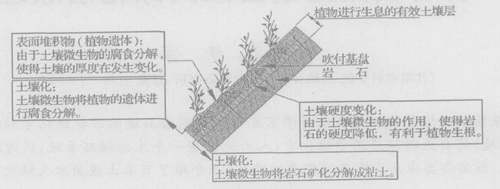 我们已经知道,土壤是由岩石经风化作用形成的,通常,在温带地区的自然风化营力作用下,岩石风化1cm,需要经过200年甚至更长时间。在自然状态下,1cm3表土含有6×106-20×106个细菌,在这些土壤菌的作用下,风化1cm岩石则需要1-2年。而土壤菌法施工后,1cm3表土含有108-109个细菌,远远大于自然状态下表土中含有的细菌数量,这就大大提高了风化的速率。在岩石风化的过程中,土壤菌进行着2种分解,一个是腐食分解,主要是指在微生物的生活过程中,将有机质分解成简单化合物和微生物生命活动所需的产物。另一个是矿化分解,是指土壤菌在腐殖分解过程中所产生的大量有机酸,使岩石矿物被分解的过程。