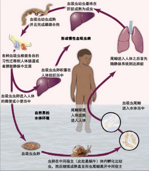 二、传播途径:包括虫卵入水、毛蚴孵出、侵入钉螺、尾蚴从螺体逸出和侵入终宿主这一全过程。其中,含有血吸虫卵的粪便入水、钉螺的存在和接触疫水是传播的三个重要环节。