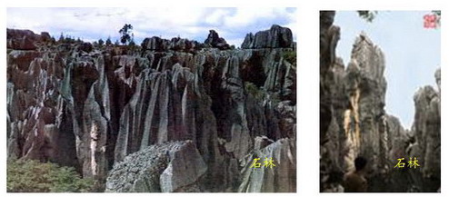 成片裸露、岩层厚度大的可溶性岩石节理裂隙和层面受地表水溶蚀、侵蚀,使岩石表面形成沟槽形态,凹槽称为喀斯特溶沟,沟槽间的突起称为石芽。在热带、亚热带地区,水热条件充沛,水的溶蚀性强,石芽在强烈的岩溶作用下生成一种特殊形态,形体高大,石芽之间的溶沟很深,沟坡垂直,坡壁上刻有平行垂直的凹槽,即石林。这类喀斯特景观的典型代表是著名的云南路南石林,石林相对高度一般20米左右,大者可达50米左右。