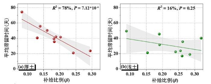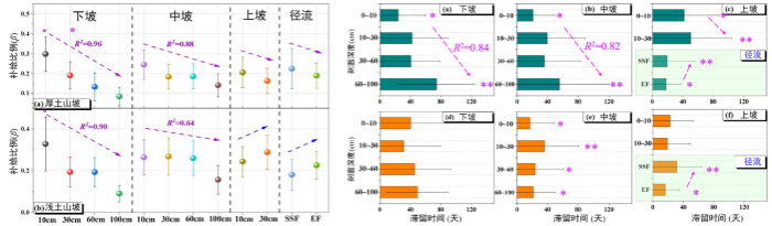 中国科学院亚热带农业生态研究所陈洪松研究员团队在广西环江通过水稳定同位素示踪技术,揭示了土壤厚度对坡地入渗和径流水补给特征的影响机制。该研究选取两处土壤厚度差异显著的山坡,通过长期原位监测获取土壤水和径流样本,并测定其氢氧稳定同位素组成?;诜侄瓮凰仄胶饽P?,量化了降雨对可移动水的补给比例、平均滞留时间及干旱期径流的蒸发损失比例。结果表明,渗透性更高的浅土山坡具有快速的水分补给特征,表现为更高的雨水补给和水分蒸发损失比例及更短的水分滞留时间(图1)。厚土山坡补给比例和滞留时间具有极显著的相关性(解释率R2=0.78),而浅土山坡这种快速且复杂的水文特征导致其通过水文参数预测过程的难度更高(图2)。因此,即便是在小流域范围,在水资源优化配置方面也需要考虑进行差异性的管理,而土壤厚度理论上是一个重要的参考指标。