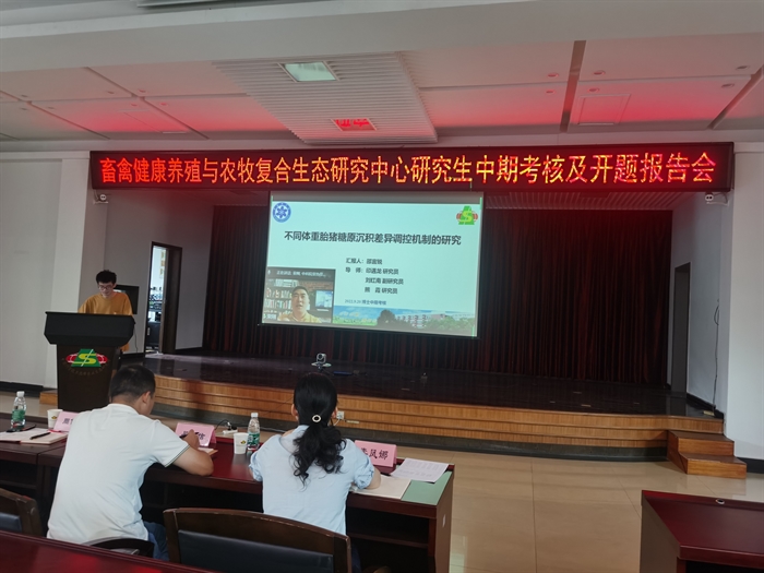博士研究生邵宜锐、查安东、郜陆敏、刘梓欣、廖思梦、刘粉粉分别作了题为“不同体重胎猪肝糖原沉积差异调控机制的研究”“微生物驱动石胆酸代谢调控宁乡猪脂肪沉积的机制研究”“尿苷和尿苷酸调控幼龄动物乳糖代谢的机制研究”“迷迭香提取物调控三河牛乳品质及其关键通路研究”“基于CRISPR/Case9双荧光报告系统和全基因组敲除文库对氧化应激调控基因与机制研究”“日粮钙、磷水平对猪微量元素吸收与代谢的影响及机制”的中期进展报告;硕士研究生郑界、肖镧林、程雅婷、项轩、袁春梅、张天西、李锐煊、丁婧、杨凡分别作了题为“日粮蛋白水平对沙子岭猪肌内脂肪沉积的影响和机制研究”“吲哚乙酸调控脂肪代谢的作用机理”“不同品种猪小肠发育及其功能特征比较研究”“谷胱甘肽缓解断奶仔猪肠道氧化应激的作用机制研究”“低能量采食对呼伦贝尔母羊肠道胆汁酸和微生物群落作用机制的研究”“山羊胰腺腺泡细胞外分泌功能相关受体分布及水飞蓟对胰腺外分泌功能的影响”“不同碳氮比及菌剂对秸秆好氧堆肥效果及堆肥微生物群落变化的影响”“日粮能量源对生长猪组织碳周转速率的影响机制研究”和“植物角鲨烯对仔猪生长性能及急性氧化应激下仔猪生长性能和肠道健康的影响”的中期进展报告;博士研究生蒙成文、张诗哲、程艳、龚成燕、冯淦熠等分别作了题为“丹参超微粉对蛋鸡生产性能和产品品质的调控作用及机制研究”“反刍动物消化道噬菌体多样性及微生态营养作用研究”“反刍动物胰腺外分泌功能影响因素及其机制解析”“有机锌高效作用机理及与日粮营养素互作效应研究”和“不同饲料原料在肠道的淀粉消失规律及其对生长育肥猪供能差异机制研究”的开题报告;硕士研究生段格艳、张仕宇、代超、姚婷、姜奥宇、赵烨嬋、霍家斌、韩萌萌分别作了题为“β-羟基-β-甲基丁酸对巴马香猪慢肌纤维的调控作用及其机制研究”“生长育肥猪体成分沉积曲线的研究”“玉米赤霉烯酮对仔猪子宫炎症和脂代谢的影响及其调控机制研究”“日粮中添加噬菌体对断奶仔猪腹泻的干预机制研究”“不同胎次三河牛瘤胃噬菌体与细菌微生物区系多样性研究”“日粮代谢蛋白组成影响山羊氮素代谢的微生物机理研究”“反刍动物瘤胃氢营养型微生物组成的日变化规律与功能解析”和“泌乳母猪低蛋白质饲粮标准回肠可消化赖氨酸的需要量研究”的开题报告。