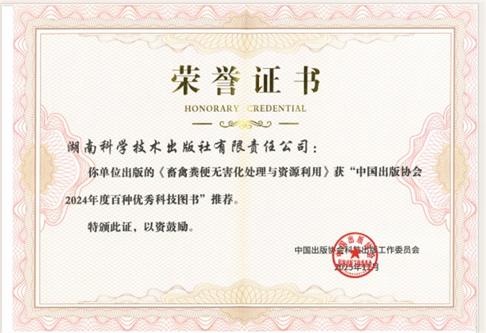 近日,由湖南科学技术出版社策划组织,印遇龙院士、朱永官院士、谯仕彦院士领衔,联合董红敏研究员、李国学教授、董仁杰教授、闫志英研究员、武深树研究员、杨兴明教授、张克强研究员、沈玉君研究员等国内农业环境与畜牧工程领域顶尖专家共同撰写的《畜禽粪便无害化处理与资源利用》一书,继入选“2022年国家出版基金优秀项目”后,再获殊荣,成功入选“2024年百种优秀科技图书”。