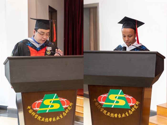 毕业生齐鸣作为毕业生代表发言,他回望自己在国科大和研究所奋斗的六年,回首做实验、读文献、写论文的难忘日夜,用感恩、奋斗和祝福三个关键词表达了不舍之情,并表示将牢牢记住国科大的“博学笃志,格物明德”的校训和研究所“练内功卧薪尝胆 图创新众志成城”的所训,继续在科研路上奋斗,追逐青春理想,以青春之我奋斗之我,在青春赛道上奔跑,争取跑出好成绩。留学生代表Kefyalew(强大)发言,他向中国、国科大和悉心培养的研究所表达了诚挚的感激,并表示来中国留学是他最美好的回忆,很感谢老师的教导和同学们的关照,并保证在今后的生活中,将在中国所学到的知识运用实践来回报老师、学校和社会。