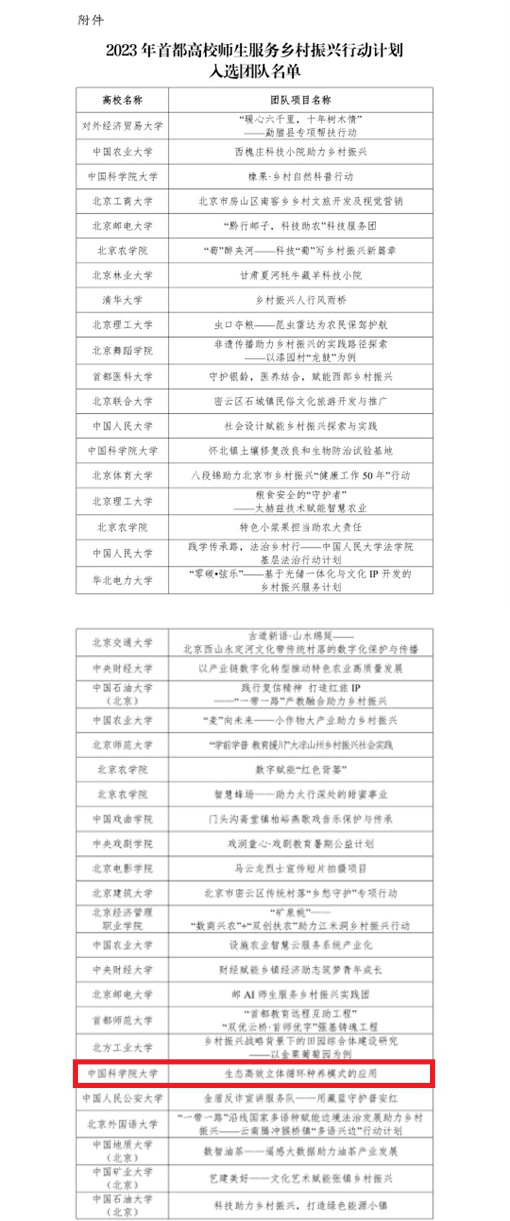 近日,北京市教育工作委员会公布《关于2023年首都高校师生服务乡村振兴行动计划入选团队的公告》,中国科学院亚热带农业生态研究所组建的“生态高效立体循环种养模式的应用”项目团队成功入选并获得资助。这是该所首次入选该类项目。