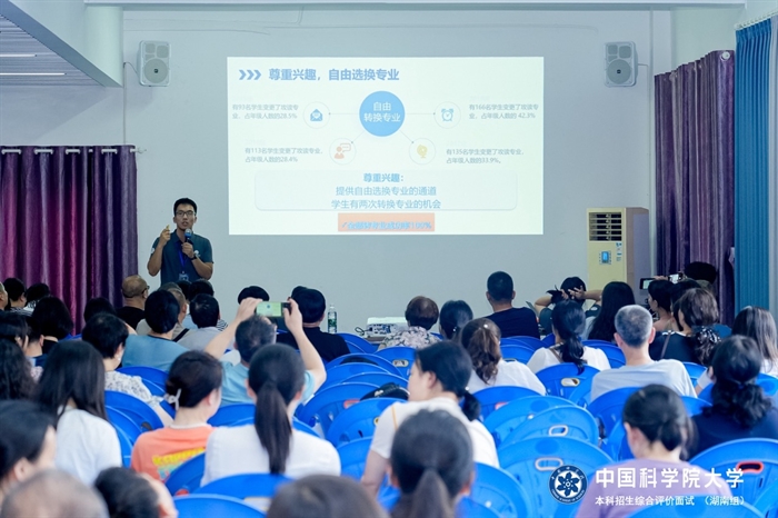 在面试同时,国科大湖南招生组与考生家长分别举行了上下午两场招生咨询会,两场咨询会分别由国科大湖南招生组共同组长、亚热带生态所原副所长王新洪和国科大党委常委、组织部统战部部长、招生组副组长谭红军主持。国科大在读湘籍直博生李文毅和大三本科生骆敏言作了学习交流报告。咨询会上,湖南招生组老师和部分在读本科生家长也参与现场咨询。
