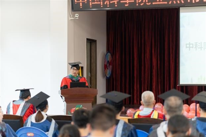 毕业生徐超昊作为学生代表发言,他向悉心培养的研究所、谆谆教诲的老师们和一路相伴的朋友们表达了诚挚的感谢,向即将别离度过七个春秋、记录着所有青春美好回忆的研究所表达了浓浓的不舍,也表示将永远记住国科大的“博学笃志,格物明德”的校训和研究所“练内功,卧薪尝胆;图创新,众志成城”的所训,在今后的生活中,努力提高自己,用更好的自己回报老师、母校和社会。研究员周传社作为导师代表发言,他作为所里曾经的毕业生,以学长的身份向毕业生们嘱咐了三点:一是学会用感恩的心体验生活的幸福;二是学会用从容的姿态追求事业的成功;三是学会用自律的行动成就世间的美好。他同时期许毕业生们大胆展翅高飞,研究所永远是同学们前行路上坚强的后盾和温暖的家,随时欢迎大家?;丶铱纯?。