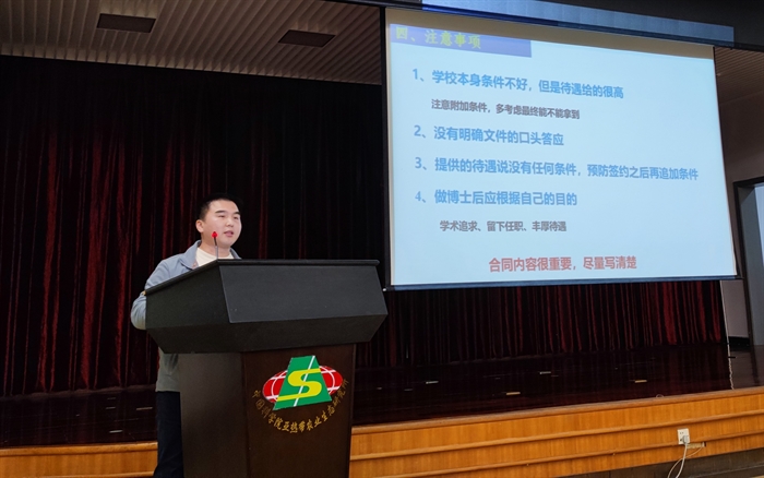 2020届毕业生夏银行(现为湖南农业大学资环学院师资博后)主要从继续科研工作的角度分享了如何求职的经验,从如何对自我分析定位到一份漂亮简历的制作,合同签订的注意事项等给出了独特见解,并鼓励同学们要主动联系并且积极向优秀的团队靠近。