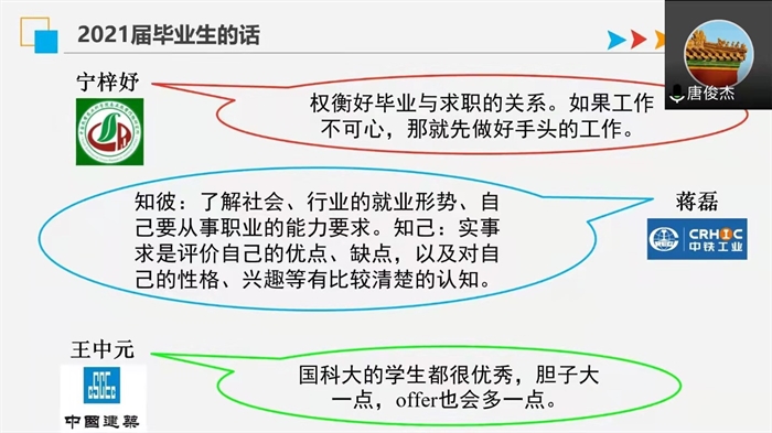2021届毕业生唐俊杰(现任职于株洲市城市建设发展集团)从求职的经验教训出发,强调了找工作要出动出击的重要性,建议毕业生应珍惜应届资格,全方位搜集就业信息,多尝试积累经验。