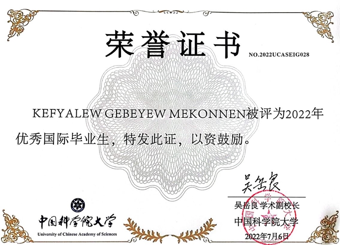 近日,中国科学院大学公布了“2022年度优秀国际学生和优秀国际毕业生”,中国科学院亚热带农业生态研究所2022届毕业生KEFYALEW GEBEYEW MEKONNEN(中文名:强大)荣获“优秀国际毕业生”荣誉称号。