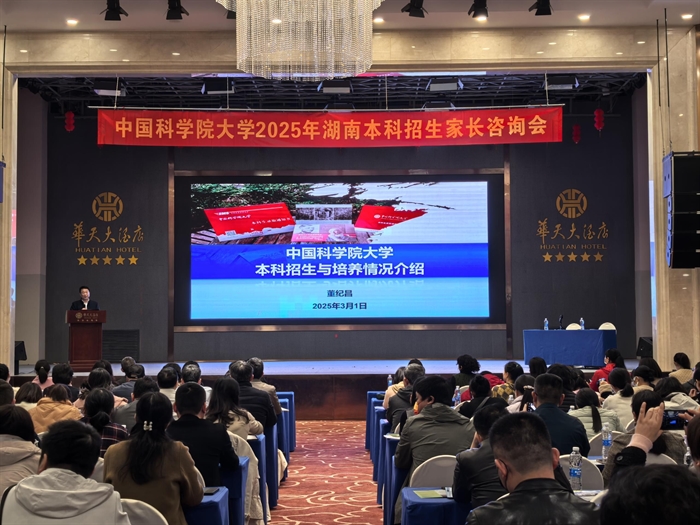 3月1日,中国科学院大学(简称“国科大”)2025年湖南本科招生家长咨询会在长沙举行?;嵋橛珊险猩楣餐槌ね跣潞橹鞒?。中国科学院亚热带农业生态研究所所长陈洪松及湖南招生组组员参加咨询会。