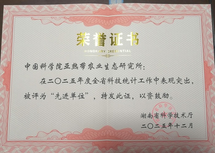 12月12日,全省高质量发展综合绩效评价科技指标专题培训暨2025年度全省科技统计工作会议在长沙举行?;嵋楸碚?025年度全省科技统计工作成绩突出26家单位,亚热带生态研究所荣获湖南省科学技术厅2025年度全省科技统计工作先进单位荣誉称号。